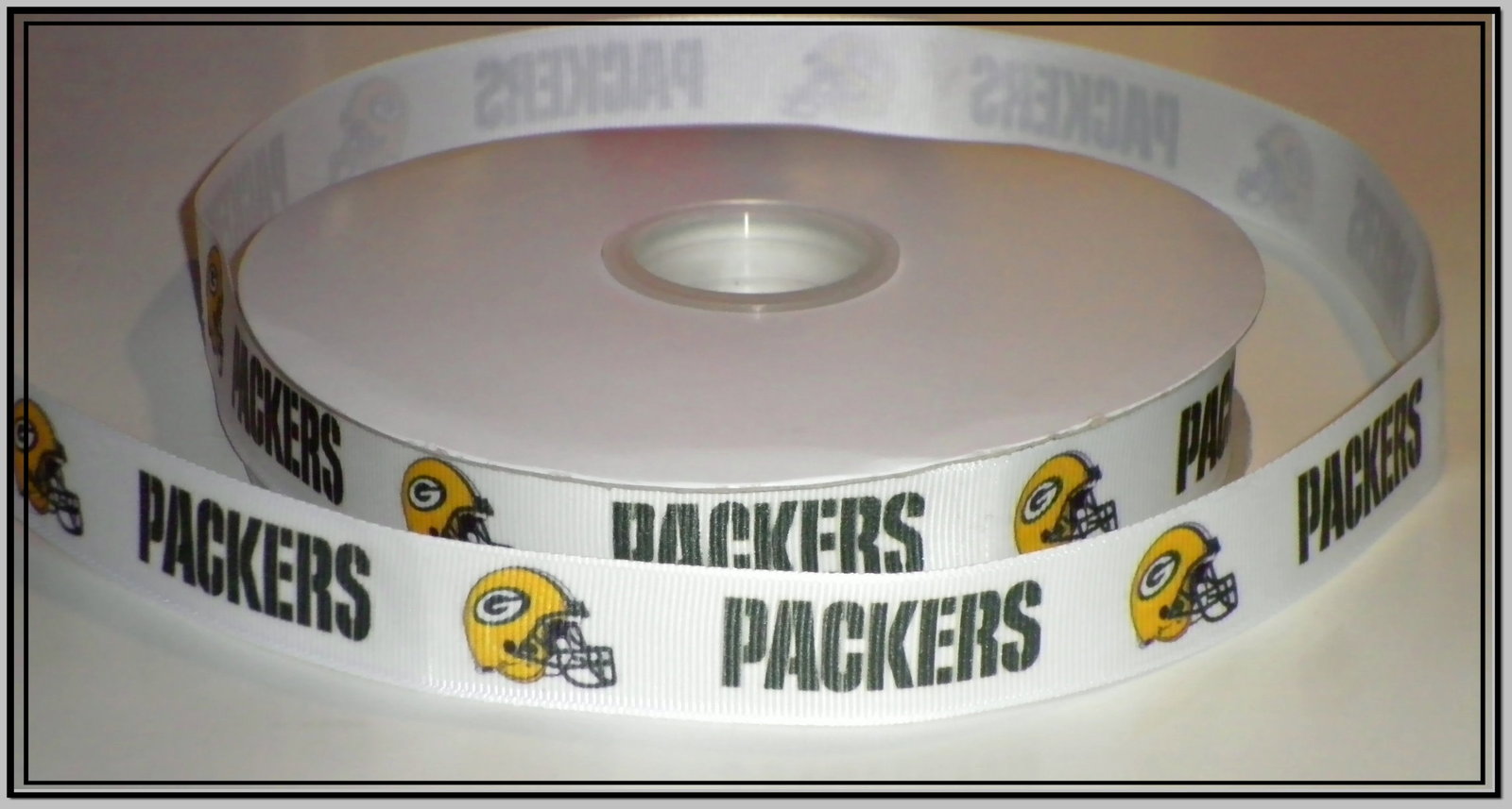 You will receive 2 continuous yards of custom designed and hand-printed 7/8" Packers inspired grosgrain ribbon. Â