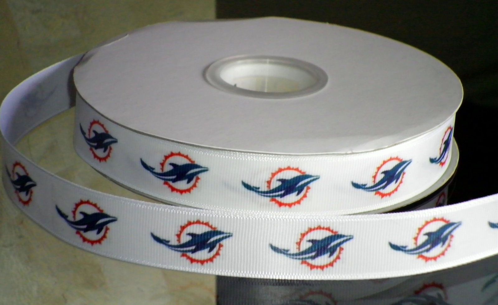 You will receive 2 continuous yards of custom designed and hand-printed 7/8" Dolphins  inspired grosgrain ribbon. Â
