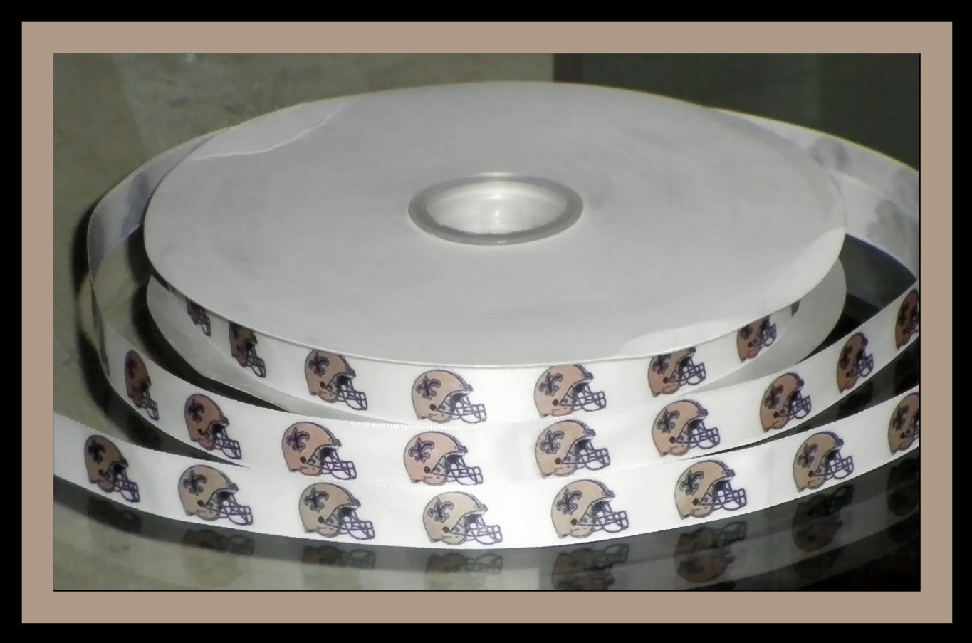 You will receive 2 continuous yards of custom designed and hand-printed 5/8" Saints inspired grosgrain ribbon.